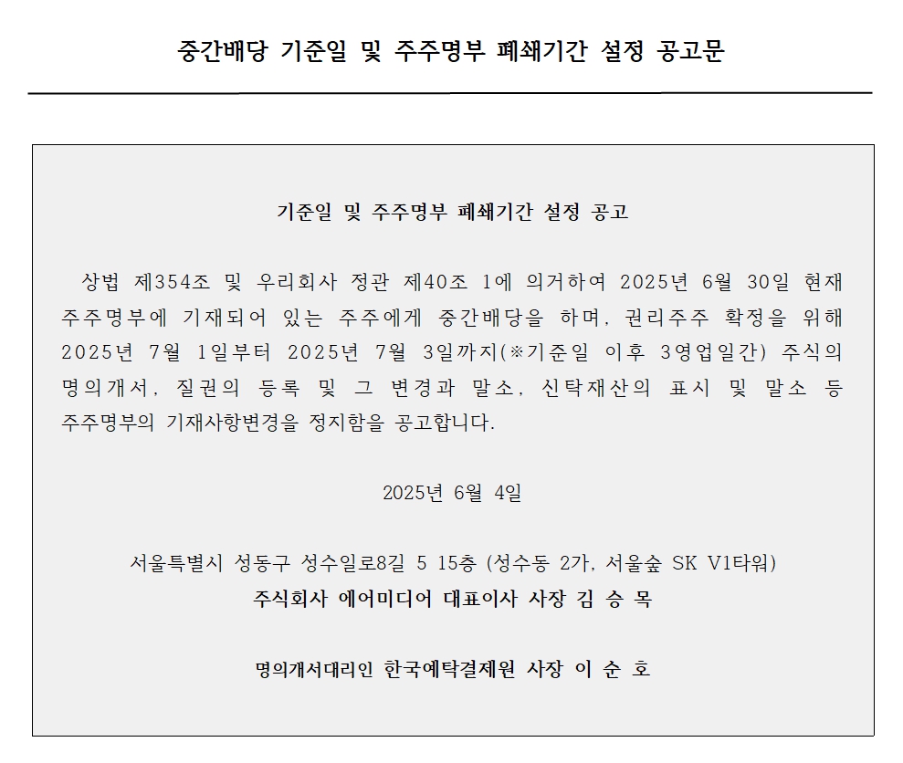 중간배당 기준일 및 주주명부 폐쇄기간 설정 공고문